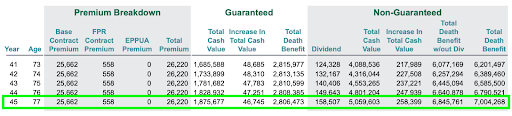 Currently, the average life expectancy in the USA is 78 years old. Let’s go further down the Illustration to look at how the Insurance Contract looks at age 77: