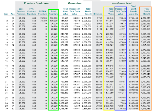 - “Premium” is an Insurance term meaning contribution. In this illustration, you’re contributing $100,000 in year one and $100,000 in year two. “Base Contract Premium” and “FPR Contract Premium” are the bare Cost of Insurance for the Death Benefit. “EPPUA” is Paid-Up Additions which is Over Stuffing a Life Insurance Contract with Cash Value.