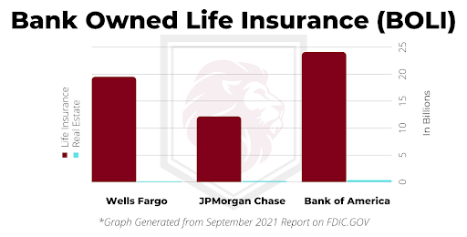 A cornerstone of the Qualified Rollover strategy is Life Insurance Contracts. I will be the first person to admit that Life Insurance is probably one of the least exciting topics in the world. However, the fact is, Life Insurance is the #1 safest asset class in the world by a long shot. Let’s look at a graph to show how much Life Insurance the biggest banks in the country own (BOLI = Bank Owned Life Insurance) vs. their #2 largest asset, Real Estate (mortgages), represented by the blue bars.
