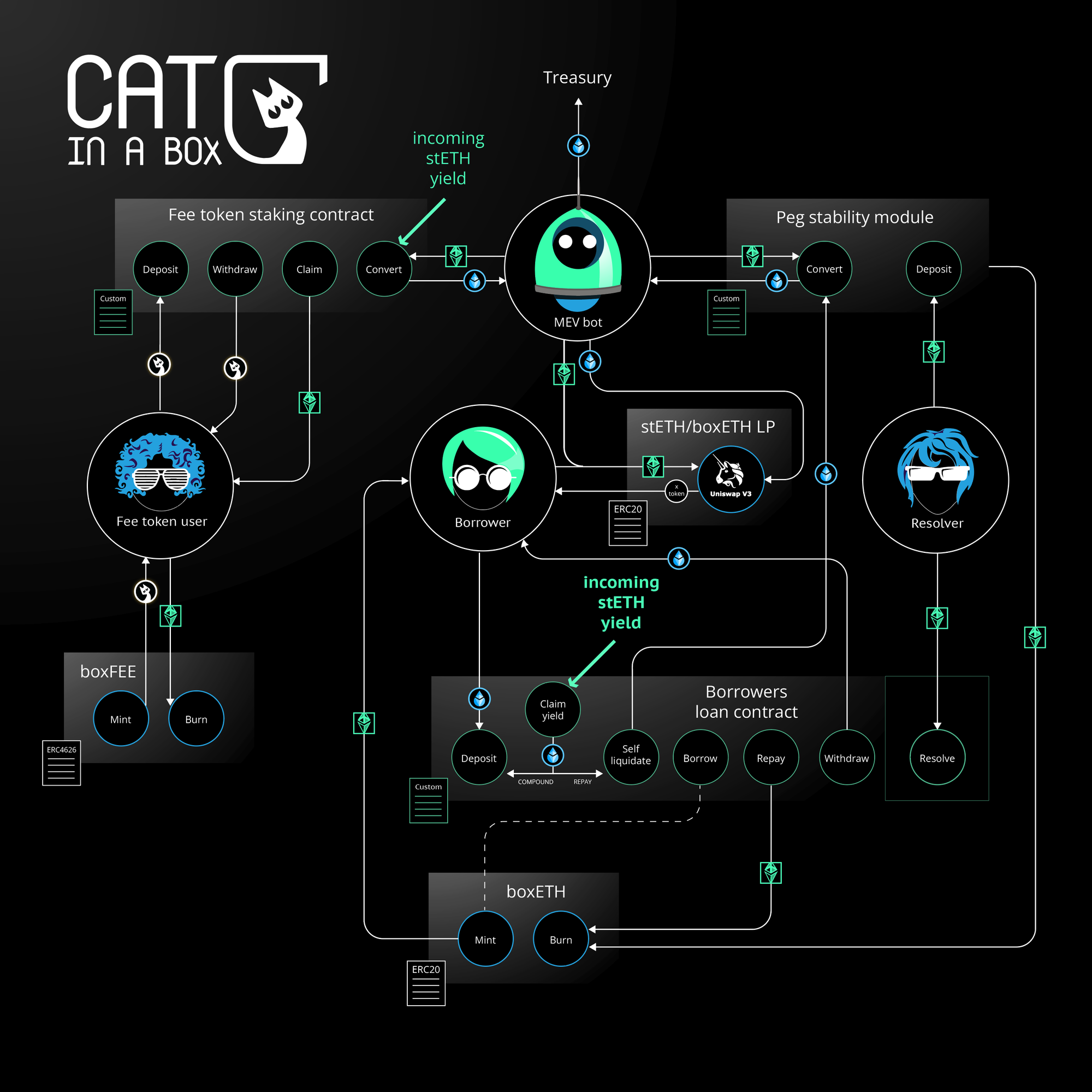 A key component of the protocol is Lido’s liquid staking derivative stETH. By depositing yield-bearing tokens (e.g. stETH) in Cat-in-a-Box, the deposit is used as collateral to mint and borrow a stETH derivative at a 1:1 ratio.