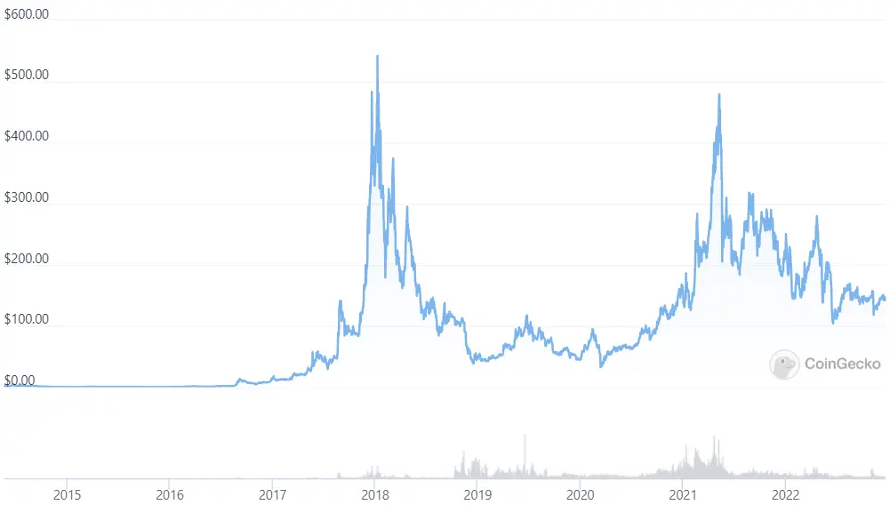 Then came the first spike. The coin’s value suddenly skyrocketed to $469.2 in December 2017 before falling back to the $40-$70 range by 2019.
